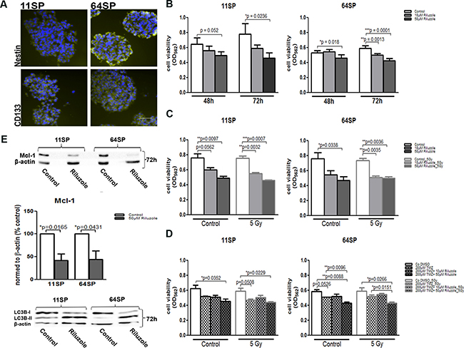In the U87MG glioblastoma cell line riluzole, an approved drug inhibits glutamate-dependent growth [17, 20]. We examined the effect of riluzole on the viability of two brain tumor stem-like cell lines: 11SP and 64SP. Prior to the analysis, we evaluated the BTSCs immunophenotype with CD133, the cell surface marker and Nestin, an intermediate filament protein, known as neural stem and progenitor cell markers (Figure 1A); we also looked at their ability to differentiate into the three different neural lineages and to form colonies in soft agar assay (Supplementary Figure 1) and in in vivo CAM assay (Figure 5). MTT assay was performed using two different concentrations—10 μM and 50 μM of riluzole—and was analyzed in a time frame between 48–72 h. The half-maximal concentration (IC50; 50% of growth inhibition) of riluzole on cell lines 11SP and 64SP were determined as > 100 μM (data not shown). The two doses of riluzole, 10 and 50 μM, were chosen because they are within the scale of the maximum tolerated dose of 100 μM in medical practice [21]. The decrease in cell viability was observed as early as 48 h in the presence of riluzole. However, a significant reduction in cell viability was detected using 50 μM riluzole at 72 h (p = 0.0236 and p = 0.0001) in both cell lines (Figure 1B). The discrepancy observed with the 10 μM dose was most likely because of the unequal number of performed experiments (Figure 1B, 1C). To corroborate our data on radio- and chemosensitivity, we examined the cell viability of cells treated with riluzole and radiotherapy, as well as irradiated cells treated with a combination of riluzole and chemotherapeutic temodal, all at 72 h. Irradiation (5 Gy) in combination with 50 μM riluzole did not show any additional effect, whereas the radiation enhanced the effect of the lower dose of 10 μM riluzole on 11SP cells only (Figure 1C). However, the effect of riluzole together with both temodal and radiotherapy did not show any additional effects (Figure 1D).