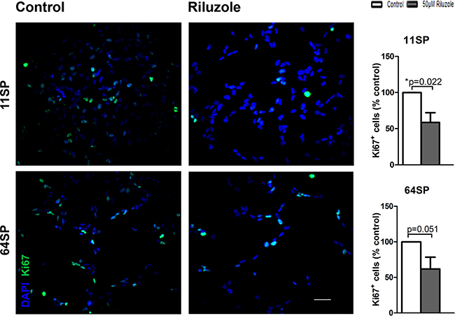 The spheres were trypsinized, and 4x104 cells were seeded in two replicates on poly-D-lysine-coated coverslips in a medium with FCS to allow them to set. After 24 h, the medium was aspirated, cells were washed with 1X PBS, and a new medium without FCS plus the appropriate treatment was added. At 24 h after riluzole treatment, the cells were fixed with methanol for 20 min at −20°C. After blocking, the cells were incubated with the primary antibody overnight at 4°C. The cells were visualized using the Alexa Fluor 488 secondary antibody (Life Technologies, Waltham, USA; 1:500) and counterstained with DAPI (Sigma-Aldrich, St. Louis, MO, USA). Finally, the coverslips were dried at room temperature and mounted with the Aqua Polymounting medium (Polysciences, Inc., Eppelheim, Germany). The slides were examined with the ZEISS Axiovert 200 Fluorescence Microscope. The proportion of Ki-67 positive cells was counted using 20× microscopic amplification. Each treatment was performed in at least three independent experiments, and each experiment was analyzed based on at least five random microscopic fields.