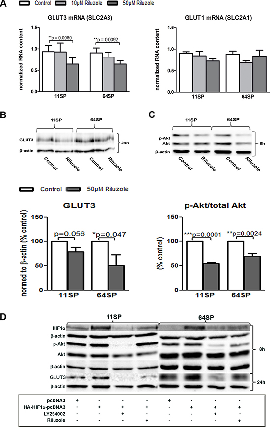 To examine if the effect of riluzole on decreased p-Akt expression acts over HIF1α and thereby leads to a reduction of GLUT3 expression, we assessed the effect of PI3K/Akt inhibitor LY294002 on these cells. Additionally, because of the difficulties in detecting the changes in native HIF1α protein concentration, we used an overexpression system. The cells were transfected with either HA-HIF1α-pcDNA3 [25] or pcDNA3 plasmid DNA and treated with LY294002 or riluzole for 8 h (for p-Akt and HIF1α protein analysis), 24 h (for GLUT3), or both. Protein analysis of the group transfected with the HA-HIF1α-pcDNA3 plasmid DNA confirmed HIF1α overexpression (Figure 3D). The samples transfected and treated with either 100 μM LY294002 or 50 μM riluzole showed a decrease in HIF1α. A significant decrease in p-Akt expression was detected in 64SP cells whereas riluzole treated 11SP showed less pronounce effect. GLUT3 protein level decreased in both cell lines and with both treatments (Figure 3D).