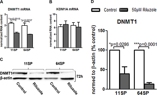 Figure 4: Decrease of DNMT1 after riluzole treatment. (A) Real-time PCR showed that the treatment of 11SP and 64SP cells with 50 μM riluzole for 72 h decreased DNMT1 mRNA expression. (B) KDM1A mRNA level did not change after 72 h. (C) A decrease in the DNMT1 protein level was confirmed, which was represented by the western blot with anti-DNMT1 antibody 72 h after the treatment. (D) Statistical analysis of DNMT1 protein expression from three independent experiments was performed using two-sided t-tests for two-group comparisons (*p < 0.05, **p < 0.01, ***p < 0.001).