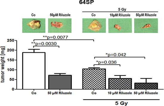 Figure 5: Riluzole reduces tumor formation of GBM stem-like cells in in vivo CAM assay. Implantation of 64SP trypsinized GBM stem-like cells in CAM assay showed the formation of tumors that had reduced growth after the treatment with 50 μM riluzole. In another set of experiments (3×), the formation of tumors was monitored after the treatment with 10 and 50 μM riluzole in combination with the radiation. The applied dose was 5 Gy. Statistical analysis was performed using two-sided t-tests for two-group comparisons (*p < 0.05, **p < 0.01, ***p < 0.001).
