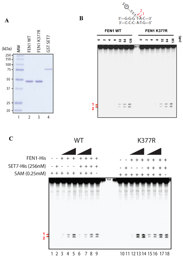 Figure 5: Flap endonuclease activity of FEN1 WT and K377R. A. Coomassie stained SDS-PAGE gel of the purified proteins (250ng) used in Figure 4B. MW represents the molecular weight markers in kDa. B. Endonuclease assays were performed with increasing amount of FEN1 WT or FEN1 K377R and 200nM of FEN1 substrate. Products were visualized using a 10% denaturing gel and corresponding to bands denoted by # 1 and # 2 in red. Scheme of the FEN1 substrate is shown on the top of the gel. C. Methylation assay was achieved on FEN1 WT or FEN K377R (at 128, 256, 512 nM) using SET7 WT followed by endonuclease assays using 200 nM of FEN1 substrate.