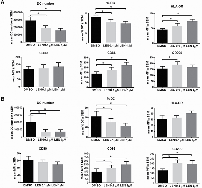 Figure 1: LEN enhanced in vitro DC differentiation from both BM and PB of MM patients. (A) DCs were differentiated from BM CD14+ cells of MM patients, cultured in RPMI 10% FBS with IL-4 and GM-CSF, for 8 days, in presence of LEN (0.1 and 1 μM) or DMSO. TNF-α was added in the last 24 h of differentiation period. Non-adherent cells were collected and analysed by flow-cytometry for DC maturation markers. Graph bars represent the mean of DC number and % and median fluorescent intensity (MFI) of DC maturation markers ± standard error of the mean (SEM) (p calculated by paired Student’s t-test) of 19 independent experiment. (B) DCs were differentiated from PB of 6 MM patients, following the same protocol. Graph bars represent the mean of DC number and % and MFI of DC maturation markers ± SEM (p calculated by paired Student’s t-test).
