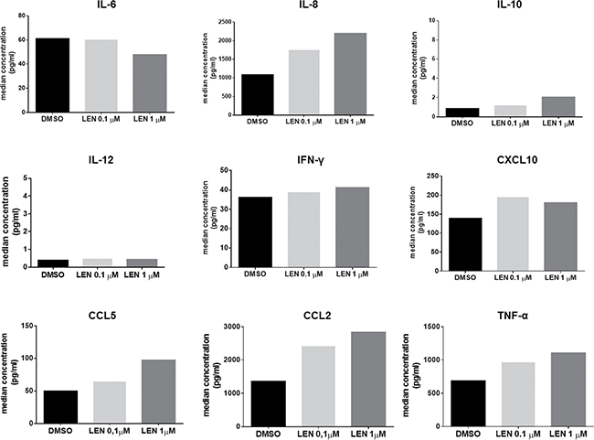 Then we investigated the potential effect of LEN treatment on cytokine production by BM DCs using a Multiplex ELISA assay. We found that LEN treatment enhanced the production of IL-8 (median concentration, DMSO vs LEN 0.1 μM vs LEN 1 μM: 1076 vs 1755 vs 2193 pg/ml, p < 0.05), CC chemokine ligand (CCL)2 (median concentration, DMSO vs LEN 0.1 μM vs LEN 1 μM: 1355 vs 2414 vs 2831 pg/ml, p < 0.05), CCL5 (median concentration, DMSO vs LEN 0.1 μM vs LEN 1 μM: 49.68 vs 64.48 vs 96.94 pg/ml, p < 0.05) and TNF-α (median concentration, DMSO vs LEN 0.1 μM vs LEN 1 μM: 684.4 vs 965.4 vs 1101 pg/ml, p < 0.05) and slightly decreased the production of IL-6 (median concentration, DMSO vs LEN 0.1 μM vs LEN 1 μM: 60.97 vs 60.30 vs 47.74 pg/ml, p < 0.05) (p calculated by Friedman test), by mo-DCs differentiated from MM patients, compared to vehicle (Figure 3).