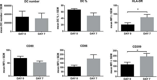 Finally, to evaluate the effect of in vivo LEN treatment on DC maturation markers, we compared the expression profile of DCs differentiated from PB CD14+ cells of 9 MM relapsed patients, purified at the baseline (DAY 0) and after 7 days of LEN treatment, just before the start of the weekly treatment with Dex. All the patients were responsive to LEN treatment.