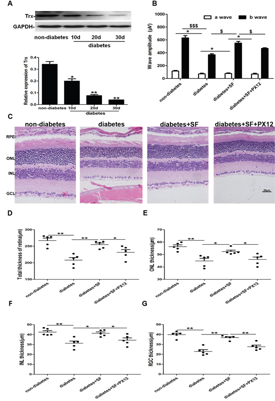 Figure 2: The relationship between Trx and retina neuronal cell degeneration in diabetic mice. (A) Trx expression in the retinas of diabetic mice. (B)-(C) Functional and morphological analysis of the protective effect of Trx on retina neuronal cell degeneration by H&E staining and ERG. The thickness of the whole retina (D), ONL (E), INL (F), and RGC layer (G) in diabetic mice. The data are presented as the mean ± SD (n=5 in each group). * p<0.05, * * p<0.01, $ $ $ p<0.001, $ p<0.05.