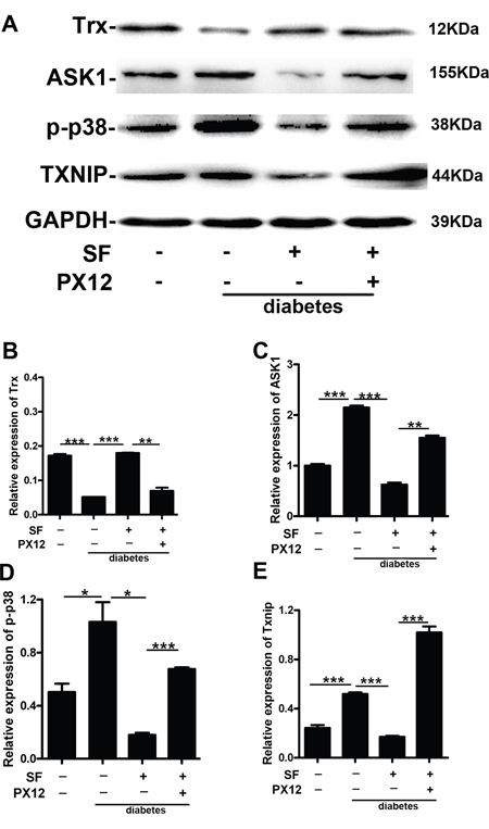 In vivo, we performed additional studies to further elucidate the related mechanisms. In the animal model, Trx protein expression decreased, and ASK1, p-p38 and Txnip protein expression was up-regulated in the diabetes group compared with that in the non-diabetes group. However, SF increased Trx expression and decreased ASK1, p-p38 and Txnip expression (diabetes+SF group versus diabetes group). Compared with the diabetes+SF group, Trx expression was decreased, and ASK1, p-p38 and Txnip were up-regulated in the diabetes+SF+PX12 group (Figure 3A-3E) (P<0.05).
