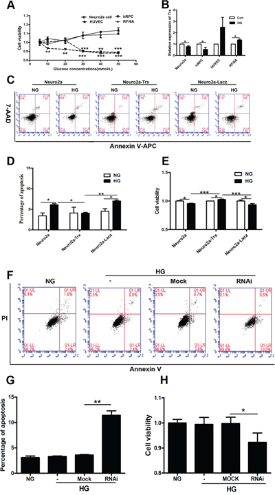 Figure 4: The effect of Trx on neuropathy prior to endothelial damage induced by hyperglycemia in vitro. (A) The viability of Neuro2a cells, hRPCs, RF/6A cells, and HUVECs was measured by CCK8 assays after treatment with different HG concentrations for 24 h. (B) Trx expression was detected by real-time PCR in Neuro2a cells, hRPCs, RF/6A cells, and HUVECs after treatment with/without HG (30 mM). (C)-(D) Apoptosis analysis of Neuro2a, Neuro2a-Trx, and Neuro2a-LacZ cells after treatment with/without HG (30 mM). X axis is Annexin V-APC staining and Y axis is 7-AAD staining. (E) Neuro2a, Neuro2a-Trx, and Neuro2a-LacZ cell viability after treatment with/without HG (30 mM). (F)-(G) The effect of Trx on apoptosis of HUVECs with/without HG treatment (30 mM). X axis is Annexin V staining and Y axis is propidium iodide (PI) staining. (H) The effect of Trx on cell viability of HUVECs with/without HG treatment (30 mM). The data are presented as the mean ± SD (n=3 in each group). * p<0.05, * * p<0.01, * * * p<0.001.