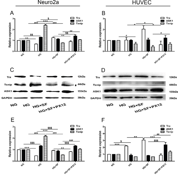 After SF and/or PX12 treatment, we detected specific molecules in vitro and in vivo to elucidate the mechanism of diabetes-induced retina neuronal cell damage and to determine why neuropathy occurred earlier than microvascular damage. Trx expression decreased under HG conditions, increased in response to SF treatment and then decreased after PX12 treatment in vitro and in vivo. The expression of ASK1, Txnip, and p-p38 increased under HG conditions, decreased in response to SF treatment and increased after PX12 treatment. However, in HUVECs, Trx expression increased in the HG group, increased in response to SF treatment and then decreased after PX12 treatment. ASK1 and Txnip expression decreased or did not change under HG conditions, decreased in response to SF treatment and increased after PX12 treatment. The results also showed that SF up-regulated Trx, which inhibited ASK1 and downstream p38 activity, thereby decreasing Txnip expression and inhibiting photoreceptor cell apoptosis. This phenomenon could explain why diabetes-induced photoreceptor cell degeneration occurred prior to endothelial damage.