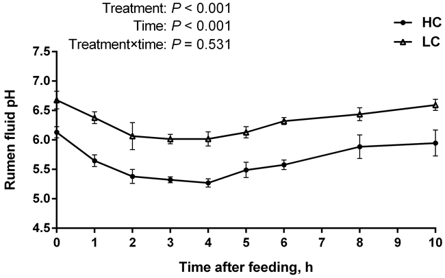 Figure 1: pH value of rumen fluid of high-concentration (HC) and low-concentrate (LC) diet. Rumen pH value was measured at different time points post feeding. Rumen pH decreased dramatically in HC group compared to LC group (mean ± SEM, n = 6). Differences between two groups were considered as significant when P < 0.05.