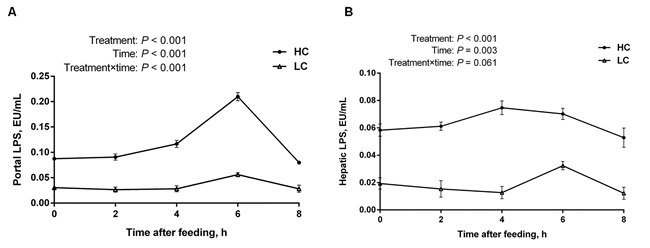 Figure 2: The concentration of LPS in portal and hepatic veins at different time points post feeding in the liver of dairy cows from high-concentrate (HC) and low-concentrate (LC) diet. A. LPS concentration in portal vein (mean ± SEM, n = 6). B. LPS concentration in hepatic vein (mean ± SEM, n = 6). LPS concentration in HC group was much higher than LC group. Difference was considered as significant between two groups when P < 0.05.