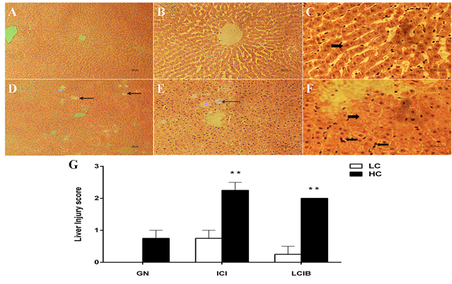 Figure 3: The effect of high-concentrate (HC) diet on hepatocytes histopathologic changes in dairy cows. Representative photomicrographs with hematoxylin and eosin staining. HC: High-concentrate diet. LC: Low-concentrate diet. A., B. and C. LC group. D., E. and F. HC group. G. Hepatocytes injury score. All the sections were observed at 100, 200 or 400 × magnification. GN: Glycogenated nuclei. ICI: Inflammatory cells infiltrate. ICIB: Liver cells injury ballooning. The thin arrow indicates GN damages; thick right arrow in F indicates ICIB damages while in C indicates no disruption; thick left arrow indicates inflammatory cells infiltrate. The damage score are expressed as the mean ± SEM and asterisks indicate the significant difference between two groups (**P < 0.01).