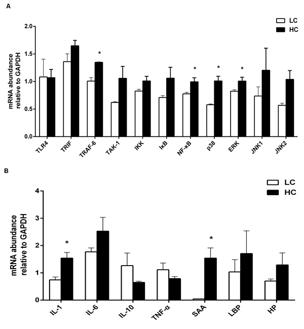The relative quantitative expression of immune-related genes in the liver is shown in Figure 4. The mRNA relative expression of immune genes involved in inflammation such as TNF receptor associated factor 6 (TRAF6), nuclear factor-kappa B (NF-κB), p38 mitogen-activated protein kinase (MAPK), extracellular regulated protein kinases (ERK) MAPK was increased by HC feeding (Figure 4A, P < 0.05), as well as pro-inflammatory cytokine IL-1 and acute phase protein SAA (Figure 4B, P < 0.05). However, the mRNA expression of TLR-4 was lower in the HC group than LC group with no significant difference between the two groups.