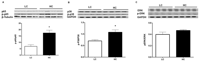 The phosphorylation levels of NF-κB p65, p38 MAPK and ERK MAPK were performed by western blot analysis. Compared to LC group, NF-κB p65 (Figure 5A) and p38 MAPK (Figure 5B) phosphorylation levels were markedly higher in the liver in the HC group (P < 0.05), indicating that NF-κB p65 and p38 MAPK were activated in the liver. But there was no significant difference between two groups of ERK MAPK phosphorylation level (Figure 5C).
