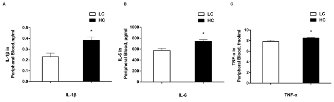 Figure 6: The concentrations of IL-1β. A., IL-6 B., and TNF-α C. in peripheral blood of dairy cows from high-concentrate (HC) and low-concentrate (LC) diet. All of three pro-inflammatory cytokines were increased obviously in peripheral blood in HC group compared with LC group. The data are expressed as the mean ± SEM, and asterisks indicate the significant differences between two groups (*P < 0.05, n = 6).