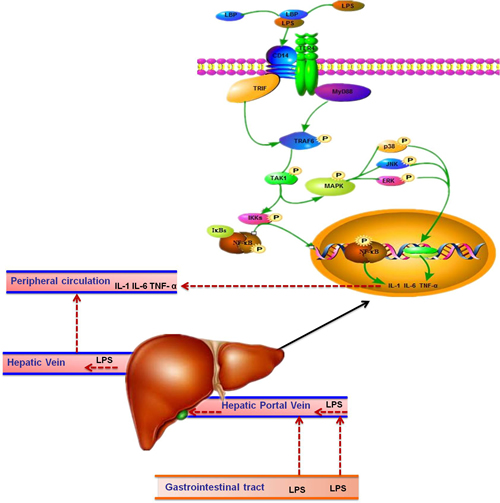 Figure 7: The route of LPS transported to the liver in dairy cows. LPS in gastrointestinal tract results from high-concentrate diet was translocated into the liver via portal vein. Then LPS combined with LBP and transported to the hepatocytes surface with the help of CD14, and recognized by TLR4. Subsequently, the complex combined with TRIF or myeloid differentiation factor 88 (MyD88) and activates TRAF6, followed by the activation of Transforming growth factor beta-activated kinase 1 (TAK1). On the one hand, TAK1 activate inhibitor of nuclear factor kappa-B kinases (IKKs) so that NF-κB could be able to escape from IKKs and translocated into the nucleus to stimulate the pro-inflammatory cytokines such as IL-1 and IL-6. On the other hand, TAK1 activate the MAPK to stimulate the pro-inflammatory cytokines production. Those pro-inflammatory cytokines released into the blood circulation and trigger the synthesis of APPs in the liver. As a result, acute phase responses in the body are induced.