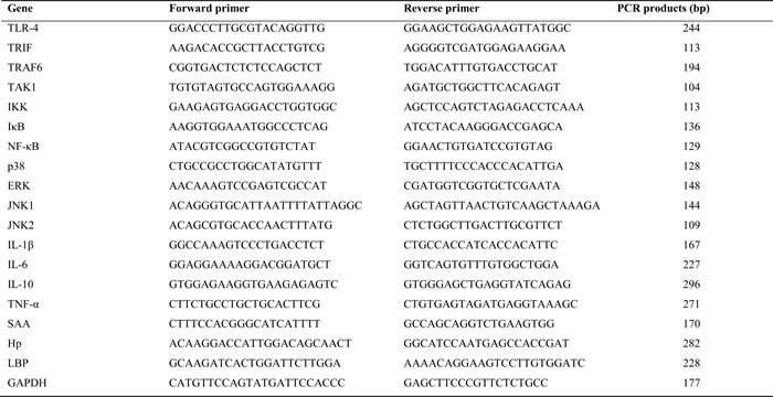 LPS is a highly potent activator of the pro-inflammatory responses, which is mediated by the toll-like receptor 4 (TLR-4) signaling pathway [13]. LPS can combine with LPS-binding protein (LBP) and transferred to the cell surface with the help of cluster of differentiation 14 (CD14) [14, 15]. Then the complex of LPS-LBP-CD14 activates TLR-4 signaling pathway and facilitates the secretion of pro-inflammatory cytokines such as Tumor Necrosis Factor (TNF-α), interlukine-1 (IL-1) and IL-6, which can cause an inflammatory reaction by activating the expression of receptors in hepatocytes and other target cells [6, 16, 17]. Systemic consequences such as leukocytosis and changes of acute phase proteins (APPs) in peripheral blood have been observed. In other words, LPS increases the concentration of LPS-binding protein (LBP), serum amyloid A (SAA) and haptoglobin (HP) in peripheral blood during SARA [3, 11].