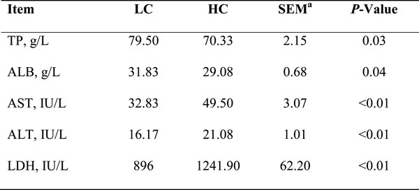 Table 3: Plasma levels of liver function indicators in dairy cows from high-concentration (HC) and low-concentrate (LC) diet