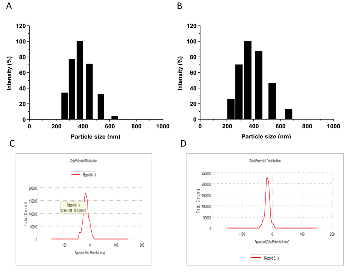 Figure 1: Histograms of the particle size of the targeted nanobubbles (A) and the blank nanobubbles (B). Zeta potential of the targeted nanobubbles (C) and the blank nanobubbles (D).