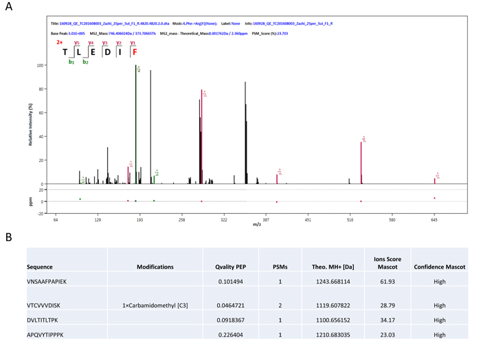 Figure 2: Identification of nanobubbles. (A) Peptide sequences were detected by tandem mass spectrometry based on the bands obtained from protein gel electrophoresis. Only b and y fragment ions were accounted. (B) MS/MS spectra matched to IgG1. All of the four peptides came from Igh and Ighg1.