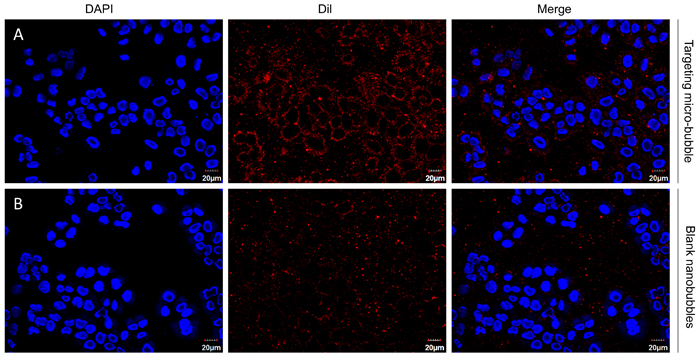 After adding H446 cells to target nanobubbles and blank nanobubble incubator, the red fluorescence probe aggregation of H446 cells in blue-stained H446 cells was observed in 1000 target nanobubbles and was 90.2 ± 3.24%. (Figure 4A) No obvious red fluorescent probe aggregation was observed around the nucleus of the small cell lung cancer H446 cell in the blank nanobubble group (Figure 4B), indicating that the SCLC cells around the targeted nanobubbles, but not blank nanobubbles, only exhibited high adhesion.