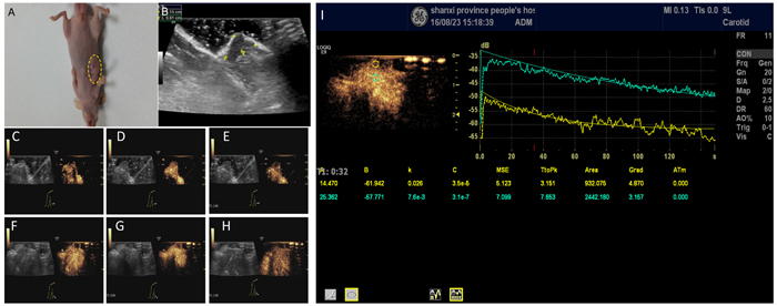 Figure 5: Contrast-enhanced ultrasonography of xenograft tumor model. A profile of SCLC xenograft tumor (A) Measurement of the tumor size showed a diameter of 1.18 ± 0.12 cm (B, C-E) Early-stage of the contrast-enhanced ultrasonography of the tumor (C), peak intensity of the contrast-enhanced ultrasonography (D), and late-stage of contrast-enhanced ultrasonography (E) in targeting nanobubbles. Yellow dotted circles denote the tumor. Images in C, D, and E include B-mode and contrast images. (F-G) Same as C-E, except for in non-targeting blank nanobubbles. (I) Comparison of the time-intensity curves between the cancerous (yellow) and non-cancerous tissue (green).