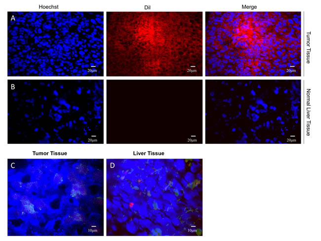 Figure 6: Dil-labeled NBs enter only the tumor tissue. DilImmunofluorescence of xenograft tumor specimens shows Dil-NBs around the nucleus in tumor tissue (A), but not in the normal liver tissue (B) Green fluorescence around the nucleus of blue-stained tumor tissue (C), whereas no obvious fluorescence around the nucleus in the liver tissue (D).