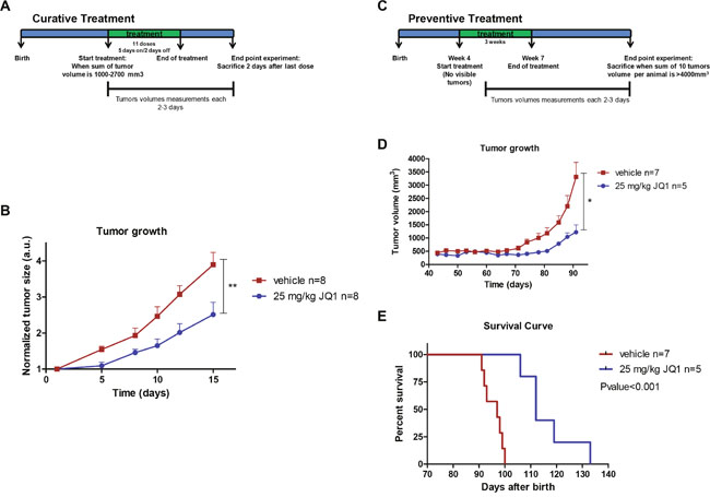 Figure 3: JQ1 treatment inhibits growth and prevents formation of luminal breast tumors in the MMTV-PyMT mouse model. (A) Design of the “curative treatment experiment”. (B) Tumor volume monitored over time in vehicle- and JQ1-treated MMTV-PyMT mice. **P<0.01. (C) Design of the “prevention treatment experiment”. (D) Tumor volume monitored over time in vehicle- and JQ1-treated MMTV-PyMT mice. *P<0.05. (E) Kaplan-Meier survival curves for vehicle- and JQ1-treated MMTV-PyMT mice. Statistical differences tested with Log Rank (Mantel-Cox) test.