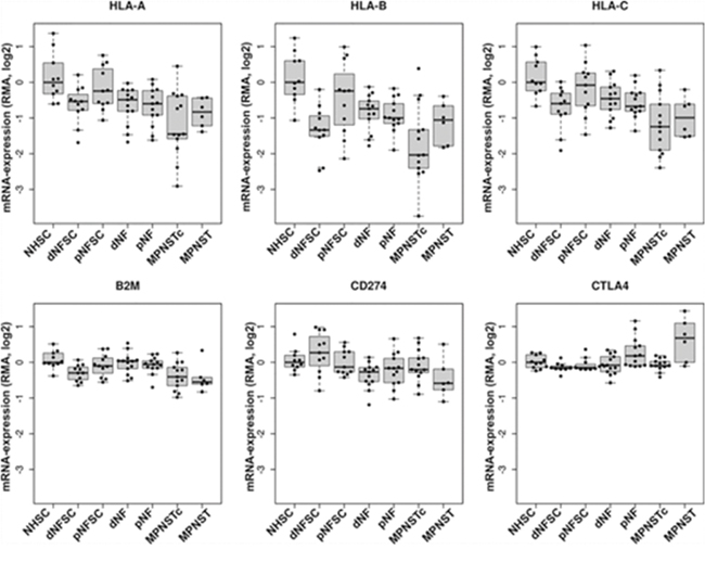 We used a pre-clinical and clinical mRNA microarray Affymetrix database consisting of thirteen dermal neurofibromas, thirteen plexiform neurofibromas, six MPNST tumors, and thirteen MPNST cell lines and normalized their results against ten samples of normal human Schwann cells (GSE14038) to identify MHC I (HLA-A, -B, and –C), B2M, PD-L1 (CD274), and CTLA-4 gene expression [24]. We used Affymetrix GeneChip Human Genome U133 Plus 2.0 Array to measure gene expression. Data were processed using GeneSpring GX v7.3.1 (Agilent Technologies) with background correction and Robust Multi-array Average (RMA) normalization. Differential gene expression was predicted using Bioconductor/ limma package [25].