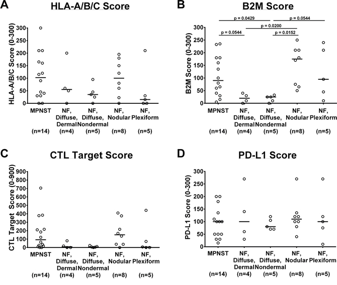 Figure 2: In vivo protein expression of immunologic markers in NF1-associated tumors by immunohistochemistry. (A) HLA-A/B/C, range 0 to 300; (B) B2M, range 0 to 300; (C) CTL Target Scores, range 0 to 900; and (D) PD-L1, range 0 to 300. Each data point represents average of 3 technical replicates for that sample. Number of samples per tumor subtype listed in parentheses below tumor subtype labels. Median of all samples within tumor subtype represented by bar. Tumor subtype scores were compared using Kruskal-Wallis non-parametric testing with the two-step method of Benjamini, Krieger, and Yekutieli post-hoc pairwise comparison to control for a false discovery rate of 0.05 with GraphPad Prism 7 software. Significant results (defined as adjusted p ≤ 0.05) indicated on graphs. CTL= cytotoxic T lymphocyte; MPNST= malignant peripheral nerve sheath tumor; NF= neurofibroma.