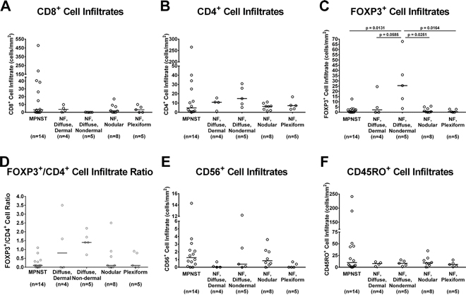 Figure 3: In vivo immune cellular infiltrates in NF1-associated patient tumor samples by immunohistochemistry. (A) CD8+ cellular infiltrates; (B) CD4+ cellular infiltrates; (C) FOXP3+ cellular infiltrates; (D) FOXP3+/CD4+ cellular infiltrate ratio; (E) CD56+cellular infiltrates; and (F) CD45RO+ cellular infiltrates. Each data point represents average of 3 technical replicates for that sample. Number of samples per tumor subtype is listed in parentheses below tumor subtype labels. The median of all samples within each tumor subtype is represented by the bar. Comparisons of cellular infiltrates between each tumor subtype were performed using Kruskal-Wallis non-parametric testing with the two-step method of Benjamini, Krieger, and Yekutieli post-hoc pairwise comparison to control for a false discovery rate of 0.05 with GraphPad Prism 7 software. Significant results (adjusted p ≤ 0.05) are indicated on graphs.