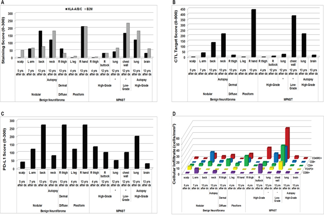 Figure 4: In vivo scoring and cellular infiltrates in NF1-associated tumors from the same patient by immunohistochemistry. (A) HLA-A/B/C and B2M Scoring; (B) CTL Target Scores; (C) PD-L1 scores; and (D) immune cellular infiltrates. Each data point represents average of 3 technical replicates for that sample. Samples obtained from the same tumor mass during the same surgical procedure are indicated by *. Dx = diagnosis; L = left; R = right; yrs = years.