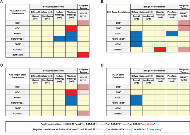 We performed Spearman correlation calculations to determine whether the expression of immunologic molecules correlate with each other or with lymphocytic cellular infiltrate patterns observed in primary tumors (Figure 5 and Supplementary Table 2). The HLA-A/B/C score correlated with B2M expression for MPNST samples but not individual benign neurofibroma subtypes (Figure 5A). We found that the HLA-A/B/C score positively correlated with CD4+ cellular infiltrates in plexiform tumors and CD8+ cellular infiltrates in MPNST tumors, while negatively correlated with the FOXP3+/CD4+ cellular infiltrate ratio for nodular and plexiform tumors (Figure 5A). The expression of B2M significantly correlated with CD45RO+ cellular infiltrates in nodular neurofibromas and MPNST tumors and with CD4+ and CD8+ infiltrating cell counts in MPNST tumors (Figure 5B). B2M expression negatively correlated with FOXP3+ cellular infiltrates in plexiform and dermal diffuse tumors, as well as the FOXP3+/CD4+ cellular infiltrate ratio and CD56+ cellular infiltrates in dermal diffuse neurofibromas (Figure 5B). We found that the calculated CTL Target Score significantly correlated with the number of infiltrating CD8+, CD4+, and CD45RO+ cells in MPNST and with CD4+ cellular infiltrates in plexiform tumors (Figure 5C). The CTL Target Score inversely correlated with the FOXP3+ cell count and the FOXP3+/CD4+ cellular infiltrate ratio for plexiform neurofibromas (Figure 5C). The PD-L1 staining score showed significant inverse correlation with the amount of FOXP3+ cellular infiltrates and the FOXP3+/CD4+ ratio in dermal diffuse tumors (Figure 5D).
