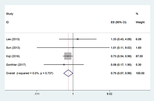 Four studies from the USA, Korea, and China compared OS between the BSO group and the OP group in 10716 patients (9376/1340) expressed as HR [11, 15, 17, 19]. Fixed effect model analysis showed that OP was significantly associated with improved OS of young patients with early-stage EC (HR 0.75, 95% CI 0.57–0.99, P = 0.044 Figure 2), with no statistically significant heterogeneity detected between studies (I2 = 0.0%, P = 0.737) (Figure 5A) and no evidence of publication bias (Egger test, P = 0.558, Begg test, P = 0.734). Of the four studies, one from China contained a small number of patients with non-endometrioid histological type. When only the three studies that were restricted to patients with endometrioid adenocarcinoma were considered in the analysis the HR of OS was of a similar magnitude (HR 0.75, 95% CI 0.57–0.99, P = 0.043).