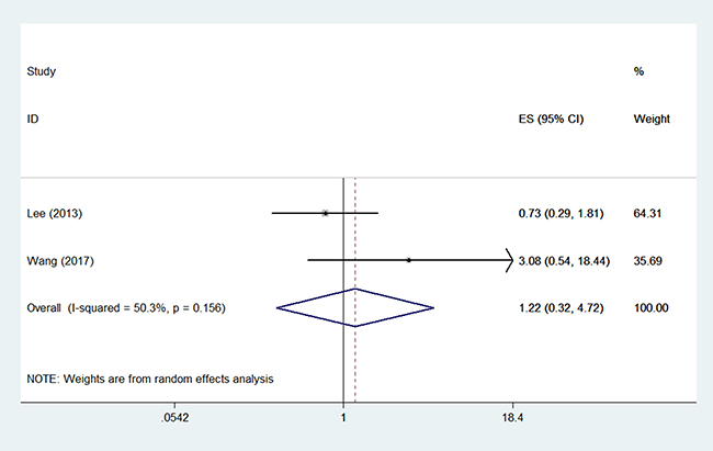 Two studies compared RFS between the two arms in 567 patients (366/201) [10, 17]. Random effect model analysis revealed that OP was not independently associated with RFS of young patients with early-stage EC (HR 1.22, 95% CI 0.32–4.72, P = 0.648 Figure 3), with statistically significant heterogeneity detected between studies (I2 = 50.3%, P = 0.156). Funnel plot showed that there might be publication bias (Egger test, P = 0.024, Begg test, P = 0.296).