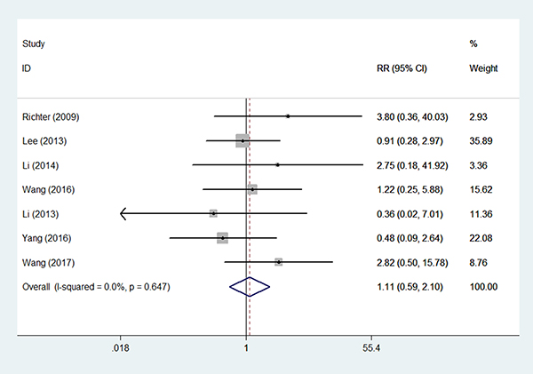 Figure 4: Forest plots illustrate the intervention results of the RRs for RFS.
