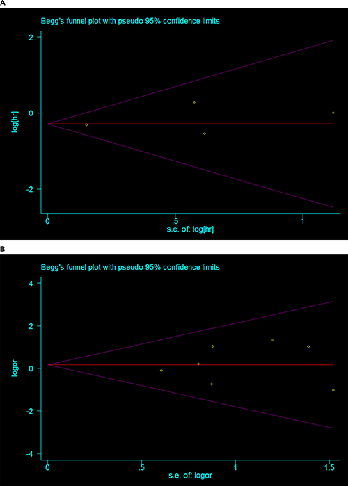 Figure 5: Begg’s Funnel plot of the included studies (A) OS-HR (B) RFS-RR.