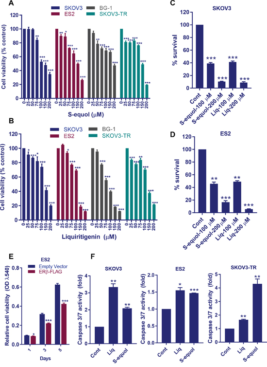 Figure 1: ERβ agonists reduce OCa cell viability, survival and promote apoptosis in vitro. (A-B) ES2, BG-1, SKOV3, and SKOV3-TR cells were treated with vehicle or S-equol or Liq for 72 h, and the cell viability was measured by using a MTT assay. (C-D) ES2 and SKOV3 cells were treated with vehicle, S-equol, or Liq for 72 h and then cultured in growth medium for additional 7 days. The number of colonies for each group was counted. (E) ES2 cells were transduced with either empty or ERβ-FLAG expression vector and cell proliferation rates were measured using MTT assay. (F) ES2, SKOV3, and SKOV3-TR cells were treated with vehicle, S-equol, or Liq for 48 h, and the Caspase-3/7 activity was measured as described in Methods. Data are represented as mean ± SE. * p<0.05; ** p<0.01; *** p<0.001.