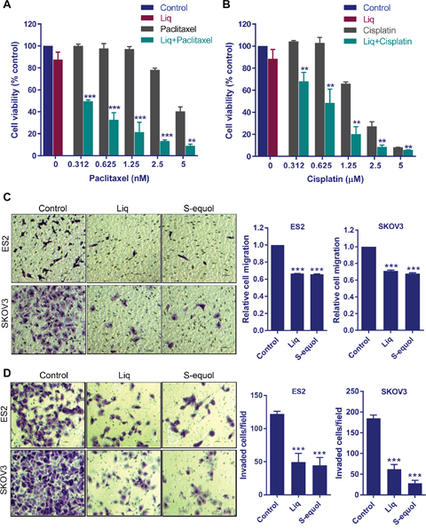 Figure 2: ERβ agonists sensitize OCa cells to paclitaxel and cisplatin treatment and reduce migration and invasion of OCa cells. (A-B) ES2 cells were pretreated with Liq (25 μM) for 48 h followed by treatment with varying doses of cytotoxic drugs paclitaxel or cisplatin for an additional 5 days. Cell viability was determined using MTT assay. (C) ES2 and SKOV3 cells were treated with vehicle, Liq or S-equol for 24 h and then used in transwell migration assays. Optical density was measured 16 h after migration. Photomicrographs of migrated cells in various treatments are shown. (D) Cell invasion potential of ES2 and SKOV3 cells treated with ERβ agonists was analyzed by using Matrigel invasion chamber assays. Photomicrographs of invaded cells in various treatments are shown. Data are represented as mean ± SE. ** p<0.01; *** p<0.001.