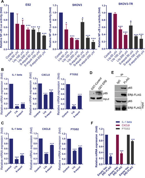 Figure 4: ERβ agonists attenuate NF-κB pathway activation. (A) ES2, SKOV3, and SKOV3-TR cells were transfected with NF-κB-luc reporter plasmid and grown for 24 h. Then, cells were treated with ERβ agonists and reporter activity was measured after 24 h. ES2 (B) and SKOV3 (C) cells were treated with Liq or S-equol (100 μM) for 24 h, and the expression status of NF-κB target genes was analyzed by using RT-qPCR. (D) ES2 cell lysates were used in pull-down assays using GST or ERβ-GST, and interaction of ERβ with p65 was analyzed by Western blotting. (E) ES2-ERβ-FLAG cell lysates were subjected to immunoprecipitation with IgG or FLAG antibodies and the interaction of ERβ with p65 was confirmed by Western blotting. (F) SKOV3 cells were transduced with empty vector or ERβ-FLAG expression vector and the expression of NF-κB target genes was analyzed by using RT-qPCR. Data are represented as mean ± SE. * p<0.05; ** p<0.01; *** p<0.001.