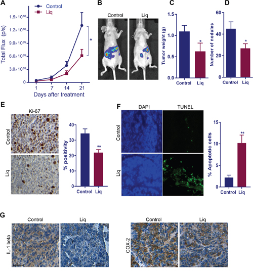 Figure 5: Effect of ERβ agonist Liq on OCa progression in vivo. (A) Athymic nude mice were implanted with SKOV3ip1-Luc cells intra-peritoneally and treated with vehicle or Liq for 3 weeks. Luciferase intensity detected by the Xenogen in vivo imaging system was used to measure tumor growth. (B) Representative images of tumor-bearing mice from control and treatment groups are shown. The tumor weight (C) and number of nodules (D) from control and treatment group are shown. Ki67 expression (E) as a marker of proliferation and TUNEL staining (F) as a marker of apoptosis were analyzed by performing immunohistochemistry (IHC) on tumor sections. For quantitation, Ki-67-positive and apoptotic cells from five different fields were counted and plotted as histogram. Data are represented as mean ± SE. * p<0.05. **p<0.01. (G) The expression of NF-κB target genes IL-1 beta and Cox-2 was determined on vehicle or Liq treated tumor sections by performing IHC.