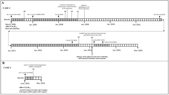 Figure 1: Clinical course, systemic and loco-regional treatment of two cases. A. Case 1 with stage at diagnosis of lung adenocarcinoma IV [T3N2M1a TNM ver 7.0],KRAS-mutated (Q61H). From April to August 2006: six courses of cisplatin plus gemcitabine obtaining partial remission (PR). From January 2007 to September 2009: second line chemotherapy with carboplatin plus pemetrexed for 12 cycles followed by pemetrexed maintenance for 9 cycles obtaining PR after 3 courses followed by radiological stability (SD). In April 2008: stereotactic radiosurgery at primary lesion (left lower lobe: 39 Gy total dose). In January 2009: palliative radiotherapy at D3 (30 Gy total dose). From December 2011 to April 2014: third line chemotherapy with pemetrexed for 46 cycles. From May 2014 to July 2014: 3 courses of carboplatin plus gemcitabine with progression disease (PD). In February 2015: PD with multiple lung, liver and bone lesions but very good performance status (PS). Re-biopsy of the right lower lobe lesion confirming KRAS-mutated (Q61H) adenocarcinoma. From March to June 2015: 4 courses of docetaxel plus gemcitabine obtaining a PR. From July to September 2015: 5 doses of nivolumab. From September to November 2016 (date of death): worsening of PS, received best supportive care only. B. Clinical course and systemic treatment of case 2: stage at diagnosis of lung adenocarcinoma IV [cT3N2M1a TNM ver 7.0] (video-thorascopic biopsie) with the molecular phenotype being EGFR WT, KRAS WT, BRAF MUT (V600E), ALK negative, ROS1 negative, RET negative. From June to August 2012: 3 cycles of first line chemotherapy with cisplatin plus pemetrexed with massive systemic disease progression, sudden worsening PS and death for PD in November 2012.