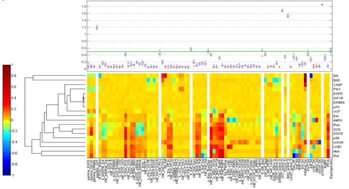 Figure 4: Calibration results. Heat map of the difference of s-OS MIRI and l-OS MIRI for all the proteins and parameters after calibration. The box plot shows the selected parameters in the calibration procedure according to their MIRI index obtained using the RAF c-KIT, p70 and Bad RPPA data.