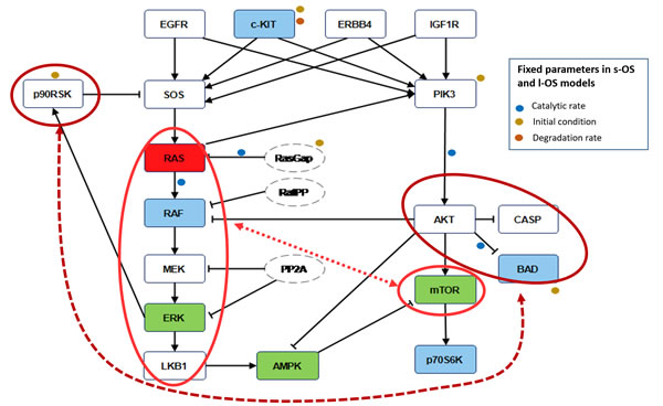 Figure 5: Robustness features. Blue nodes in the pathways are the proteins used in the calibration procedure to obtain the s-OS patient and l-OS patient models. Green nodes are selected to validate the model prediction compared with RPPA data. Red node is the KRAS protein not available as RPPA measure but sequenced in both patients. The red circles and the dashed lines in the pathways denote the nodes that influence the higher global robustness in the s-OS patient vs the l-OS patient. The fixed parameters in s-OS and l-OS calibrated models are related to the signal pathways.