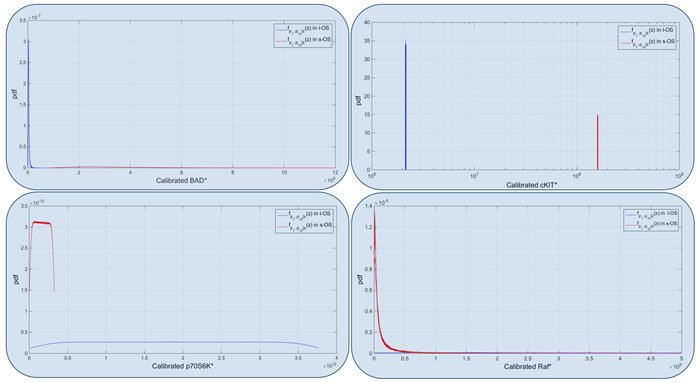 Figure 6: Model calibrated. Calibrated probability densities for Bad, c-KIT, p70 and RAF proteins in s-OS and l-OS patients, generated fixing 10 parameters and sampling 76 parameters with hypercube of 10000 samples and repeated for 100 different realizations. Blue boxes are related to Figure 5 and are the proteins used to calibrate the two models.