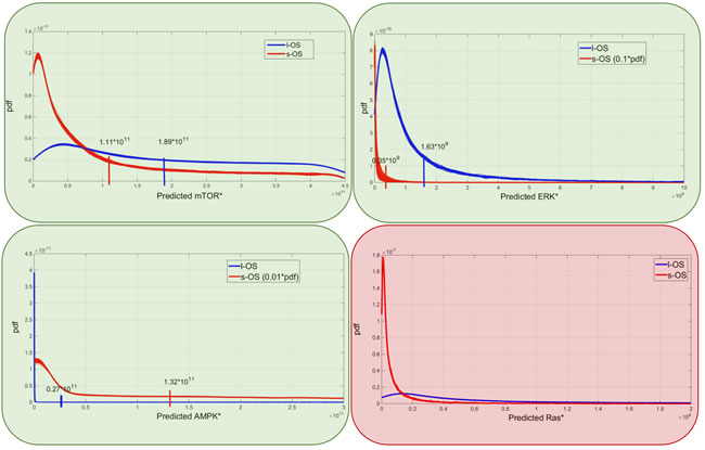 Figure 7: Model predictions. Predicted probability densities for ERK, AMPK, mTOR and KRAS proteins in s-OS and l-OS patients, generated fixing 10 parameters and sampling 76 parameters with hypercube of 10000 samples and repeated for 100 different realizations. Green and red boxes are related to Figure 5 and are the proteins selected to validate and produce prediction of the models, respectively.