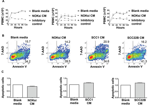 To determine the impact of HNSCC on proliferation of PBMCs, these cells were stimulated with conditioned medium (CM) from UM-SCC-1 and UM-SCC-22B, or a non-neoplastic cell line (NOKsi). In contrast to CM from NOKsi, CM from UM-SCC-1 and UM-SCC-22B significantly inhibited proliferation of PBMCs (Figure 1A). To verify that the inhibitory effect was not due to apoptosis of PBMCs, apoptosis was quantified. Notably, the SCC-mediated inhibitory effect on proliferation of PBMCs was not accompanied by a significant increase in apoptosis, assessed at both 48h (Figure 1B, 1C) and 120 h (data not shown).
