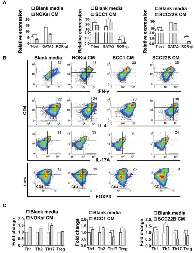 Figure 3: HNSCC-derived cytokines inhibit Th17. A. Gene expression of transcription factors associated with Th1, Th2 and Th17 phenotypes (T-bet, GATA3 and ROR-gt respectively) of PBMC stimulated for 96h with CM of NOKsi, UM-SCC-1 and UM-SCC-22B assessed by RT-qPCR (left to right). B. Representative dot-plots of the immunophenotyping of CD4+ cells after stimulation for 96h with blank media and CM from NOKsi, UM-SCC-1 and UM-SCC-22B (left to right) assessed by flow cytometry. C. Fold change of the proportion of the CD4 phenotypes in each experimental condition in comparison to control (RPMI1640). *p < 0,05, **p < 0,01, ***p < 0,001.