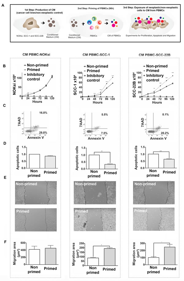Figure 5: Immunomodulation of PBMCs by HNSCCs (‘priming of PBMCs’) leads to pro-oncogenic effects independent of direct contact. A. Schematic of experiments. B. Proliferation of NOKsi, UM-SCC-1 and UM-SCC-22B cell lines cultured in the presence of conditioned media (CM) from non-primed (CM PBMC-RPMI, negative control) or primed PBMCs (i.e. from PBMCs incubated for 96h with CM from NOKsi, UM-SCC-1 or UM-SCC-22B cells). C. Representative dot-plots of the apoptosis assays of NOKsi, UM-SCC-1 and UM-SCC-22B cells after 48h of exposure to CM from non-primed and primed PBMCs. D. Mean and standard deviation of the fold change of apoptotic NOKsi, UM-SCC-1 and UM-SCC-22B cells after 48h exposure to CM from non-primed (control) and primed PBMCs. E. Representative images (40X magnification) of the migration assay (24h) of NOKsi, UM-SCC-1 and UM-SCC-22B cells exposed to CM from non-primed (control - CM PBMC-RPMI) and primed PMBCs. F. Quantification of the migrated area for each cell line (NOKsi, UM-SCC-1 and UM-SCC-22B). *p < 0,05, **p < 0,01, ***p < 0,001.