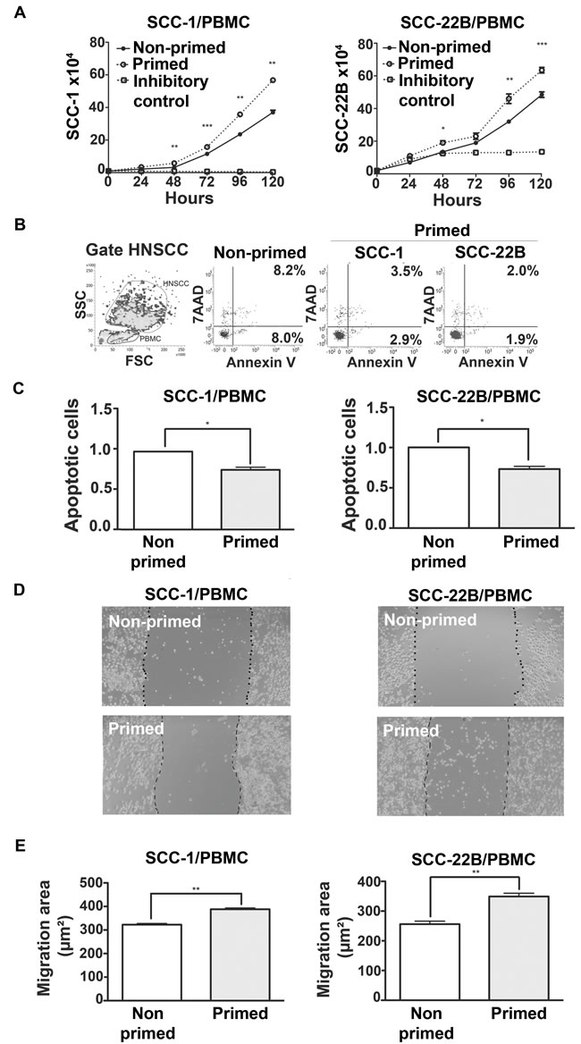 To assess if subversion of the immune cells caused by HNSCC secreted products also affects direct cell-to-cell contact, PBMCs primed with CM from two HNSCC cell lines (UM-SCC-1, UM-SCC-22B) for 48h were co-cultured with the respective HNSCC cell line. Proliferation of HNSCC co-cultured with primed PBMCs was significantly greater than HNSCCs co-cultured with non-primed PBMCs (cultured in regular medium for 48h prior to the co-culture) (Figure 6A). Moreover, apoptosis in both HNSCC cell lines was reduced when co-cultured with primed PBMCs compared to co-culture with non-primed PBMCs (Figure 6B and 6C). Migration of both HNSCC cell lines was also significantly enhanced when co-cultured with primed PBMCs (Figure 6D and 6E). Collectively these data show that HNSCC-modulated PBMCs confer an advantage to proliferation, survival and migration of HNSCC.